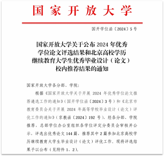 近年来,学校始终深入贯彻落实立德树人根本任务,高度重视学位论文管理和指导工作,严把质量关出口关,充分发挥优秀论文的示范作用,调动和增强学生、指导教师的积极性和主动性,推动学位工作内涵式发展,切实提高开放教育人才培养质量。