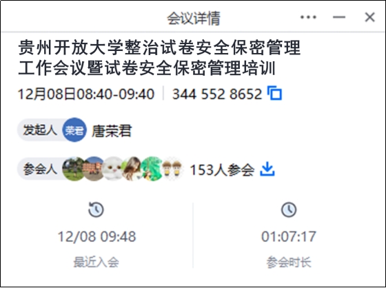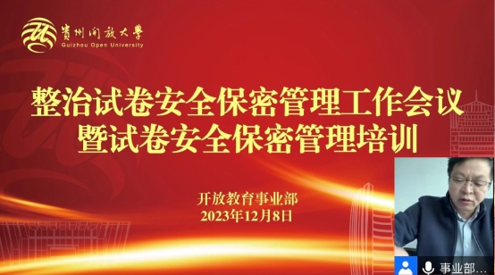 2023年12月8日上午10点,按照国家开放大学《关于开展试卷安全保密管理专项整治工作方案》的要求,为深入推进开放教育高质量发展,整治试卷安全保密管理中存在的违规问题,坚决遏制试题泄露行为,我校在全面梳理试卷安全保密管理工作风险隐患的基础上,面向全省各分校(学院)、学习中心开展线上试卷安全保密管理工作会和管理培训,来自各级办学单位共计153人参加了会议。