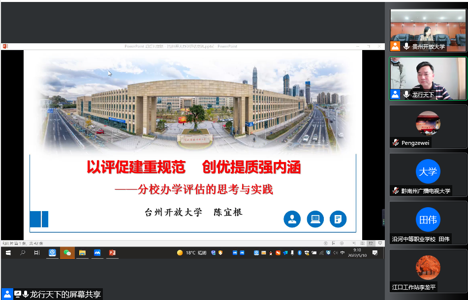 为顺利推进我校办学评估迎评促建各项工作,不断深化全省系统对评估工作的认识和实践,2022年5月10日上午,我校通过网络会议方式开展了系统分校迎评促建工作培训。培训会由台州开放大学陈宜根副教授主讲,全省10所分校及部分学习中心、开放教育学院、省校评建办,共272人参加了培训。
