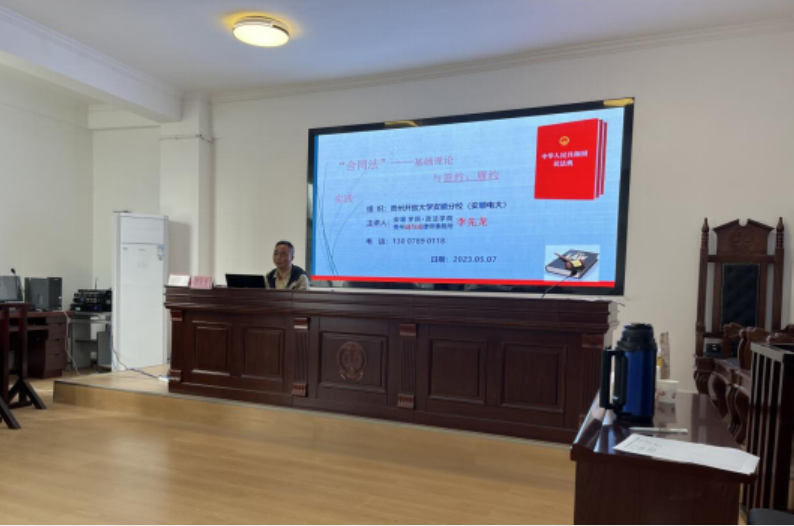 其次,安顺分校邀请来自安顺学院政法学院教授李先龙做题为“‘合同法’漫谈——基础理论与签、履约实践”的学术讲座。李教授围绕《中华人民共和国民法典》的出台,立足于合同编的主要内容简要介绍了合同的重要基础理论,随后结合实践强调了合同签订过程中的注意事项,使大家对于合同在工作、生活中的重要性有了更深的认识。
