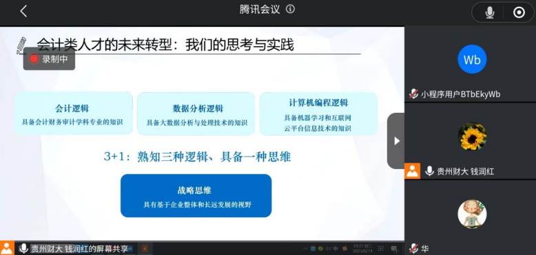 为进一步促进贵州开放大学开放教育系统专业研究水平,推动开放教育系统内专职教师人才培养、科学研究、服务社会的专业创新能力,提高贵州开放大学会计专业网络教学创新团队教师对于专业前沿发展的认识,2023年6月14日晚上19:00贵州开放大学会计专业网络教学创新团队特聘请贵州财经大学会计学院副院长钱润红教授在线上举办名为“会计的变与不变”的培训讲座。参加本次讲座的有贵州开放大学会计专业网络教学创新团队全体教师以及贵州开放大学会计专业的学员。