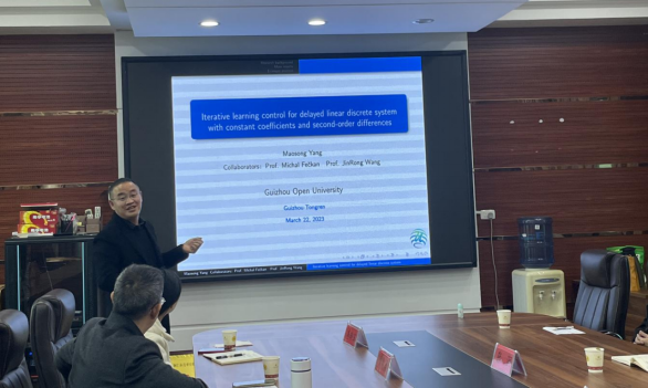 首先,数学专业网络教学创新团队主持人杨茂松副教授作了题为《Iterative learning control for delayed linear discrete system with constant coefficients and second-order differences》学术报告,并分享了在攻读博士期间科研论文写作体会。其次,针对数学专业团队科研项目申报、科研论文写作以及开放教育数学与应用数学专业毕业论文和学位论文等方面开展交流讨论,并对学位论文的要求作解读。交流会上,大家围绕教学科研畅所欲言,解答学生及论文指导老师提出的问题,对未来科研工作设想进行了交流。最后,主持人作总结发言。